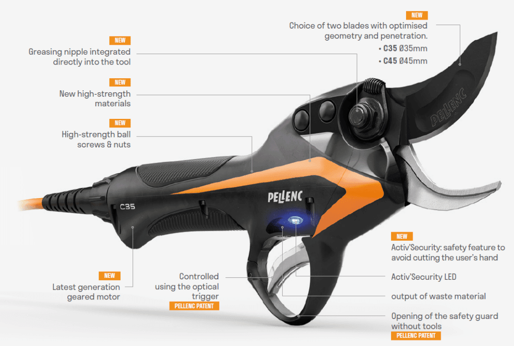This latest generation of pruning shears is a convergence of cutting-edge technologies, making vineyard pruning faster and more efficient than ever before. Powerful and light, they can easily be adapted to the diameter and hardness of the wood thanks to the options of a 35 mm (model C35) or 45 mm (model C45) diameter cutting head. Safety as a priority: the new PELLENC-patented Activ’Security safety feature stops the blade instantly if it comes into contact with the user’s hand, whether they are wearing a PELLENC glove or not. Connected to the ULiB 150, 150P, or 250 battery, these pruning shears will keep going for at least one full day of work in the vineyard.